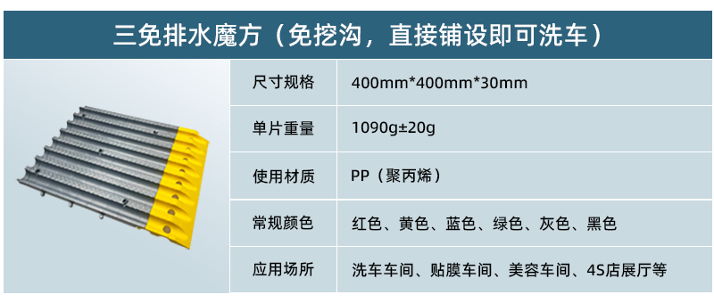 1、免挖溝,直接鋪設即可洗車。 2、免清淤,泥沙順自有排水溝直接排走。 3、免防水,接口處打防水膠后徹底防漏水。 4、非常耐用,容易清理、耐油脂、酸和化學品。 5、極佳承重載力,適合高人流量及轎車通過場所。