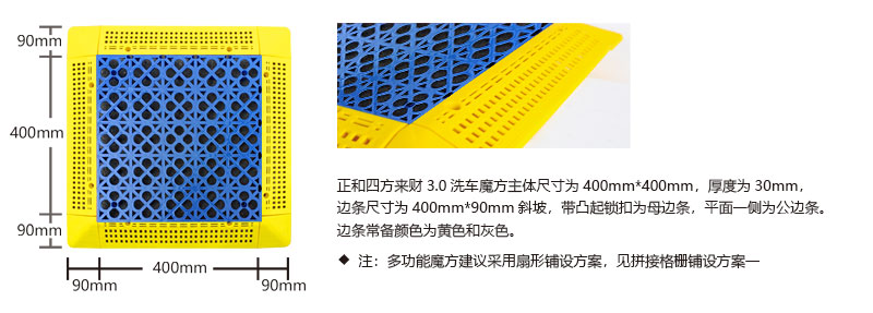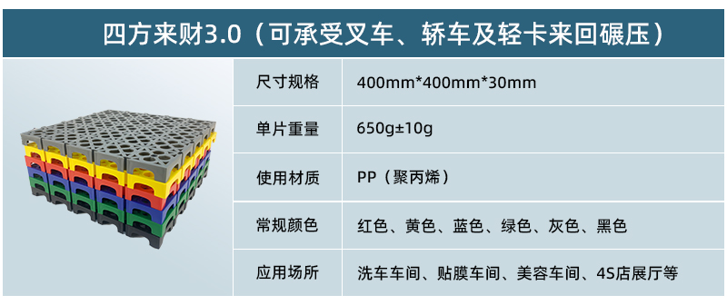 1. 分為3.4.5.厚度,解決不同厚度,統(tǒng)一紋路的問題 2. 啞光平紋設(shè)計(jì),防滑,美觀,易清潔 3. 選用高級(jí)原料,加入其他輔料,顏色亮麗,無異味,無污染 4. 顏色為紅黃藍(lán)綠黑灰六色,滿足客戶用色需求,搭配屬于自己的風(fēng)格 5. 通扣鎖扣設(shè)計(jì),容易鋪設(shè)且容易拆卸打理 6. 加強(qiáng)支撐,不容易出現(xiàn)壓壞壓斷現(xiàn)象,滿足大多數(shù)車輛施工的要求 7. 使用年限長(zhǎng),五年超長(zhǎng)質(zhì)保,使用無后顧之憂 8. 十字支撐,保證承載最大化的同時(shí),且易排泥排水