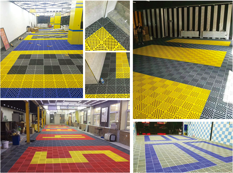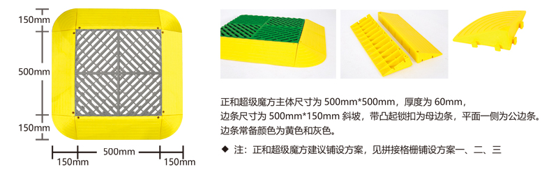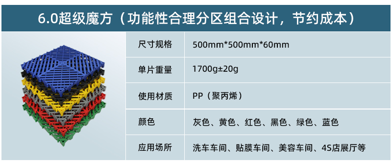 超級魔方產品綜合了以前產品的所有優點,包括結構設計、防滑紋路、尺寸間距、加大鎖扣、矩陣支撐等,將產品厚度提升到60毫米的超高厚度,真正的實現了汽車店鋪的免挖溝鋪設。